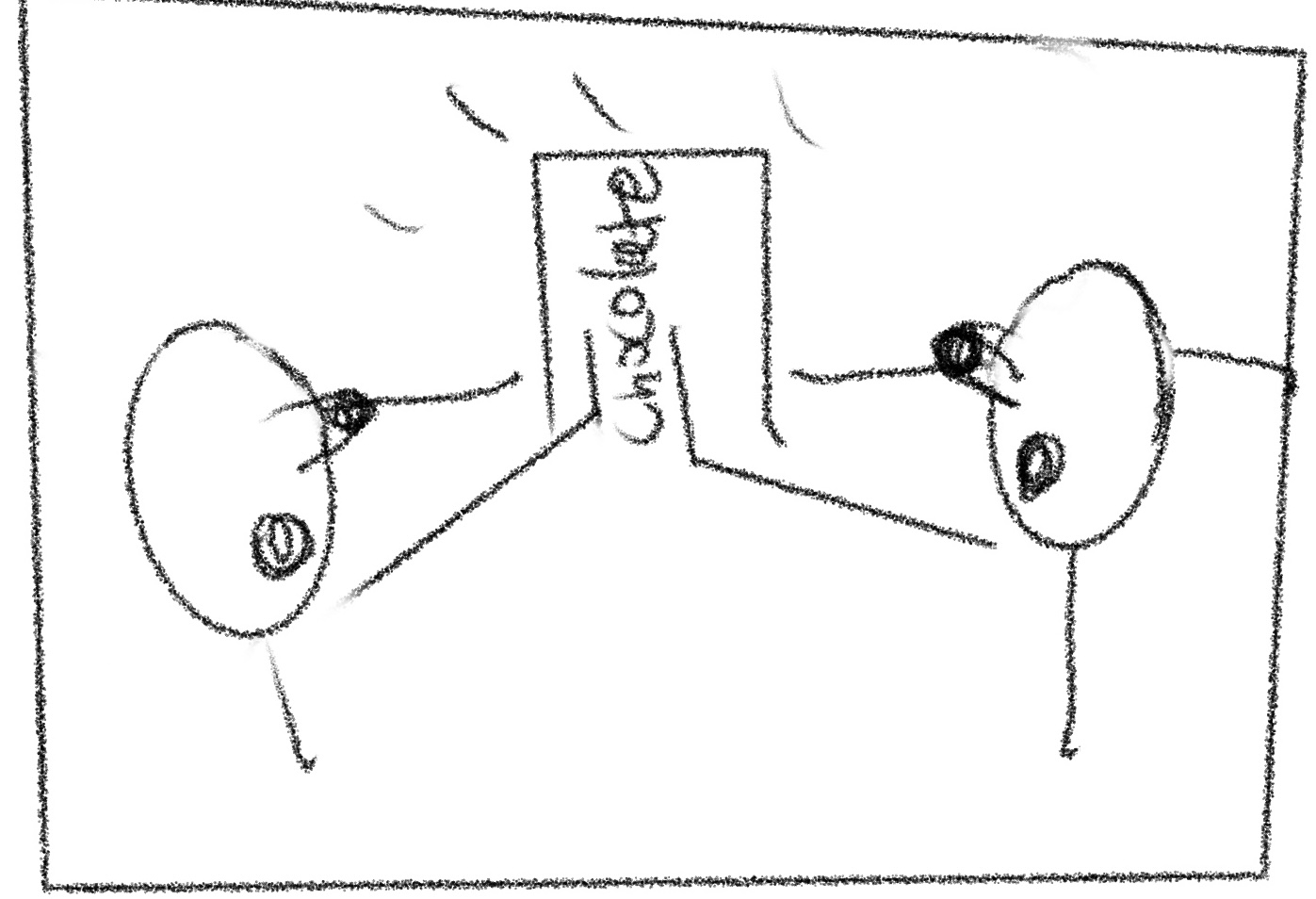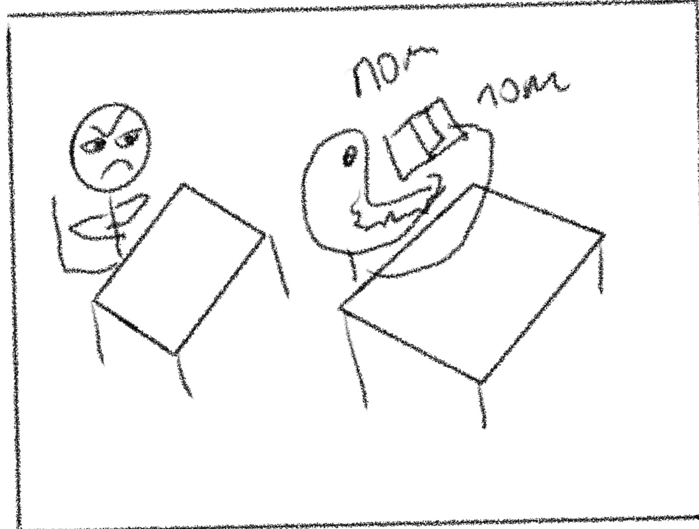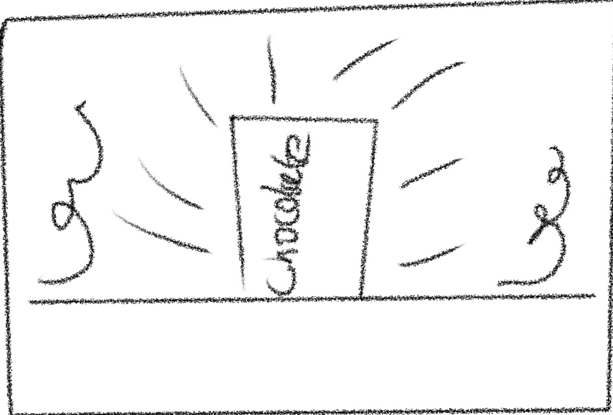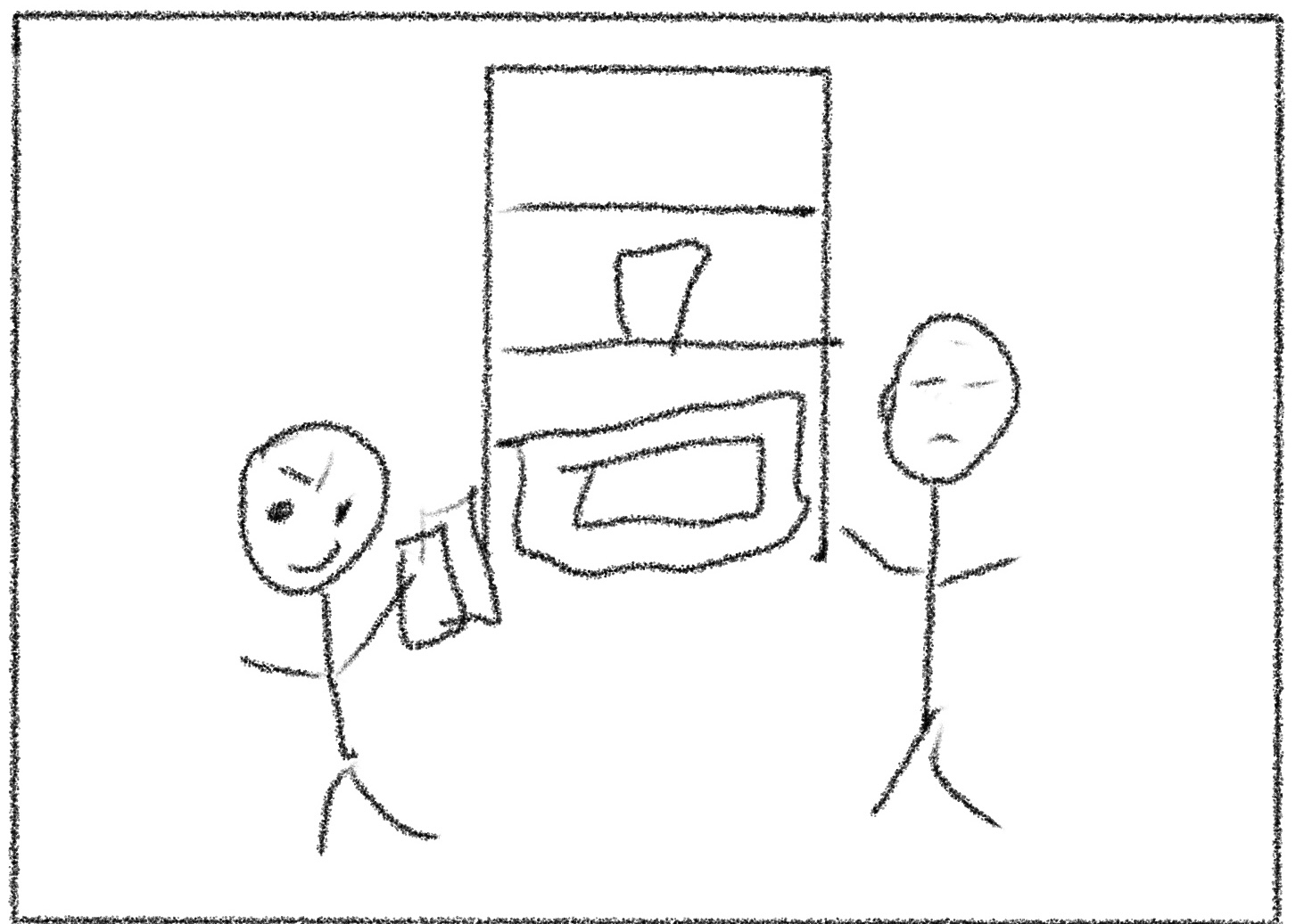 Student doing their workTheir stomach growlsRealizes they're hungryOooh! Look, food!CHOCOLATERun like the wind!We have arrived at the vending machineWait a second, who are you?Concentrating...Concentrating...I have...Money!!!I have...Nothing!!!Nothing?!Oh...Glares at classmate resentfully